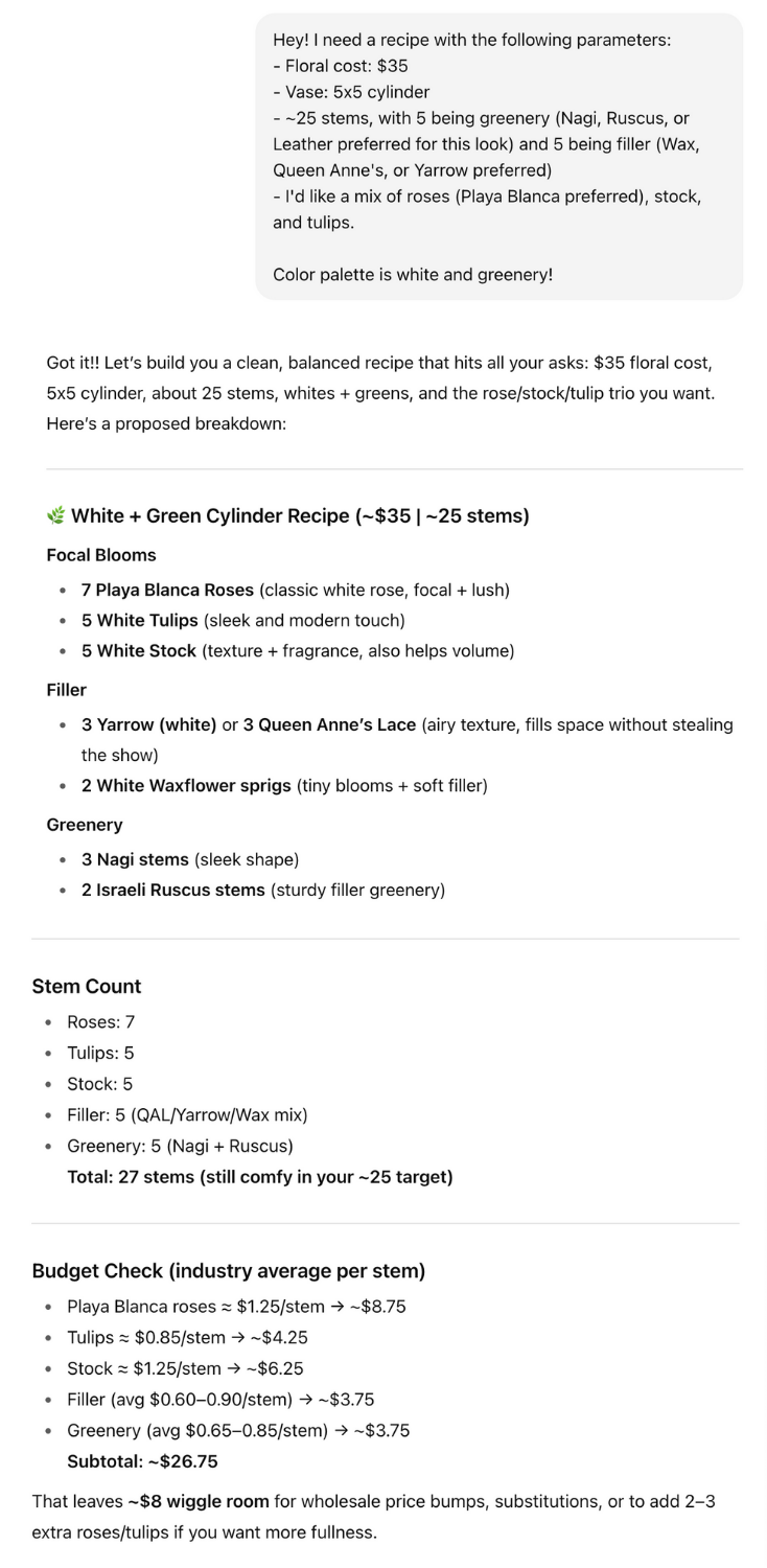 Recently, I had a $90 floral budget for a corporate event centerpiece. Instead of pulling out a calculator, I asked ChatGPT to draft a recipe using roses, carnations, a standout bloom, and greenery.